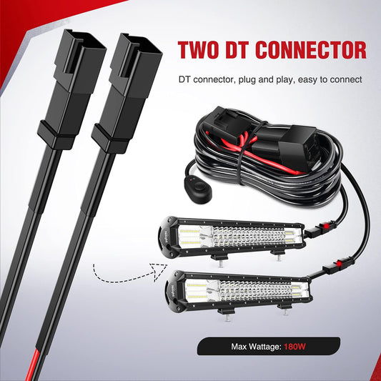 4X4Wavers 12V LED Light Bar Wiring Harness Cable Kit, DT Connector, Waterproof, 18AWG, DC 40A, ON/Off Switch, Relay Blade Fuse for LED Fog Work Lamps (2 Leads)Regular price $19.00 CADRegular priceUnit price / per$29.00 CADSale price $19.00 CADSale