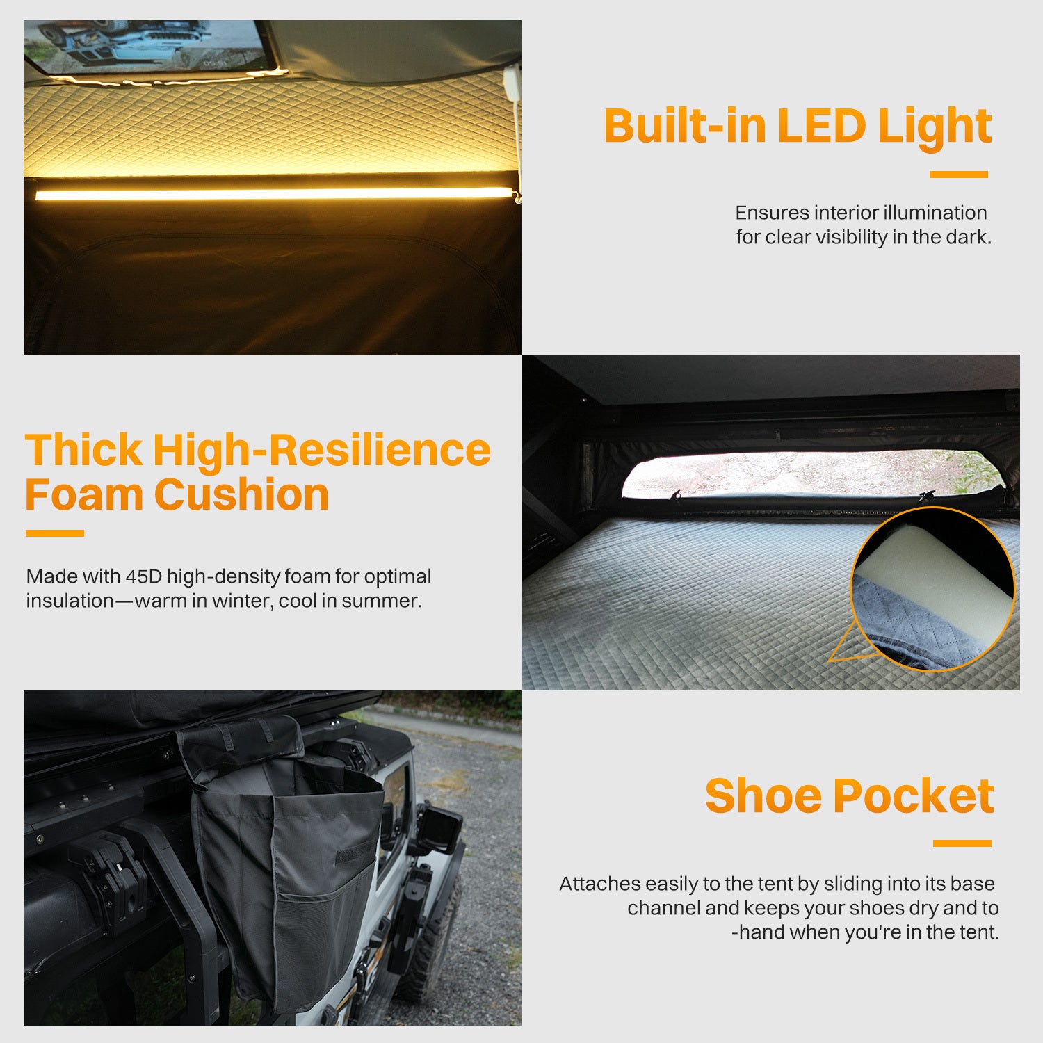 - 100% Aluminum Alloy Shell + 300D High-Density Oxford Fabric: Featuring an aluminum alloy design coupled with 300D high-density Oxford fabric, this rooftop tent is exceptionally durable, resistant to damage, aging, and thermal expansion, ensuring long-term use. Unlike plastic corners that degrade over time, leading to leaks within a year after exposure to seasonal changes.