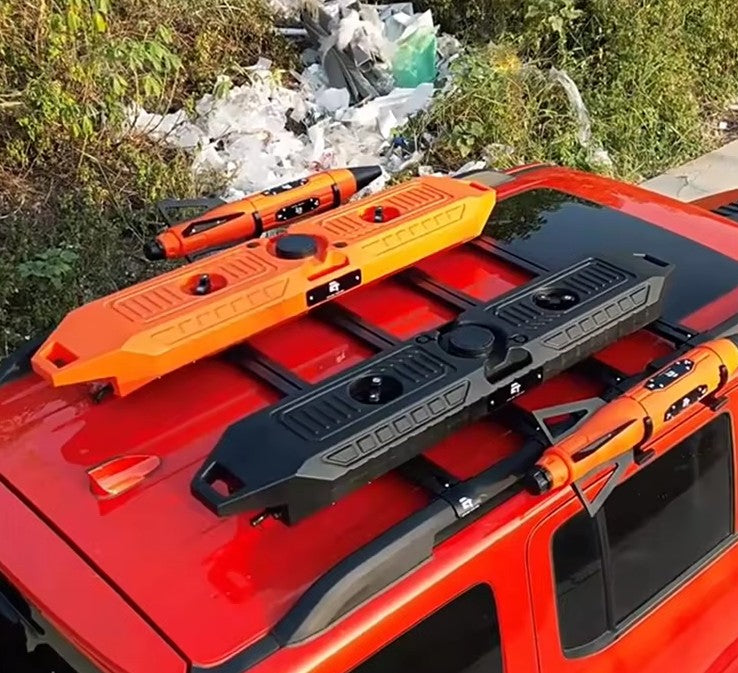 made of durable plastic and sheet metal, is designed for roof rack installation, perfect for camping and outdoor adventures. Its robust build and vibrant orange color ensure both functionality and visibility.